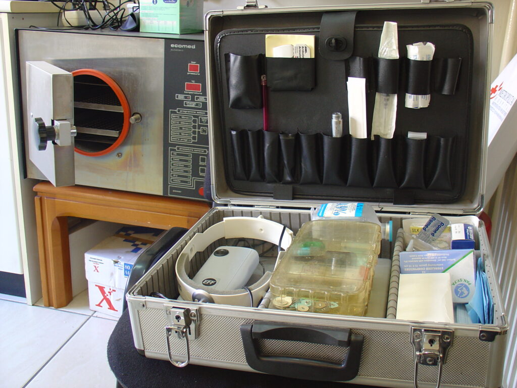 Επιπλέον ο οδοντίατρος φέρει μαζί του και μια δεύτερη βαλίτσα, ειδικά σχεδιασμένη, που λειτουργεί και ως πάγκος εργασίας, για να μεταφέρει όλα τα απαραίτητα: διάφορα περιφερειακά μηχανήματα, αποστειρωμένα εργαλεία και οδοντιατρικά υλικά.